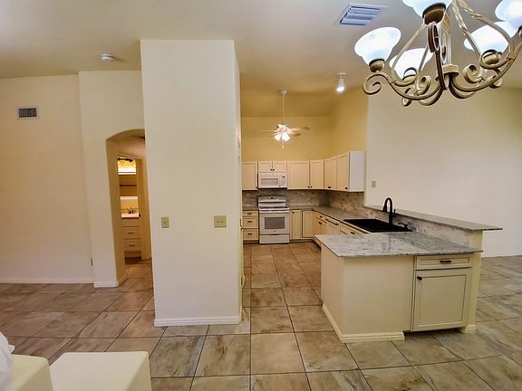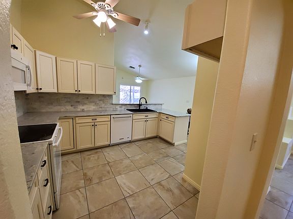 Don't miss this beautiful 3 bed/2 bath move in ready home available in Rancho De Colinas. An excellent west Tucson community, near schools and parks and within easy reach of the I-10, downtown and the U of A. Desirable open floorplan offers separate living and family rooms with gorgeous tile flooring and elegant light fixtures. Impressive kitchen features white custom cabinetry, coordinating white appliances, sleek quartz countertops and breakfast bar. Soaring vaulted ceilings, neutral paint tones and ample natural lighting throughout. Bedrooms are inviting with soft plush carpet and the master includes a walk-in closet and a full en-suite with dual sinks. Very secluded backyard is fully enclosed with block fencing and complete with a covered patio. See it and make it yours today!