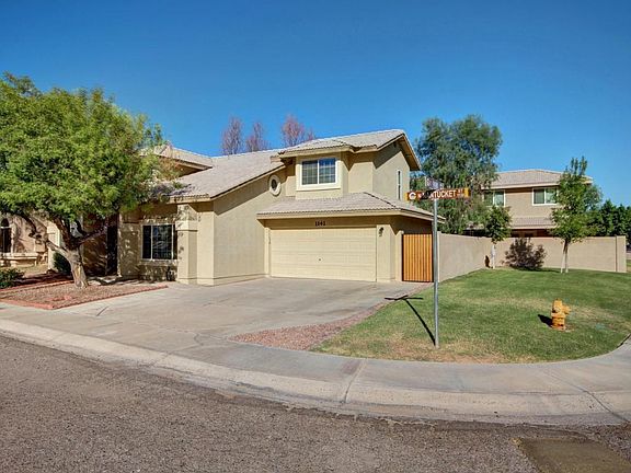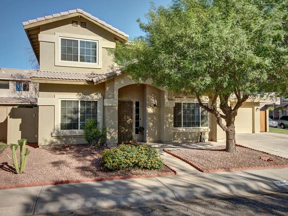 Beautiful corner lot home in Countrywalk, Chandler! Soaring ceilings and neutral tile flooring throughout the lower level. Newer carpet installed throughout the remainder. Kitchen offers newer finished counters, ample counter space, and black appliances. One bedroom and full bath is downstairs. Master plus four beds are upstairs. The light and bright master suite has plush carpet and a great reading area on the window seat, which features extra storage. Newer exterior paint, plus all new windows throughout, a $11,000 upgrade that offer plenty of every savings! Garage has epoxy flooring, laundry room, & separate exit. Backyard features a covered patio with lush green grass, mature trees, and plenty of room for entertaining, and two storage sheds. All this plus a community pool!