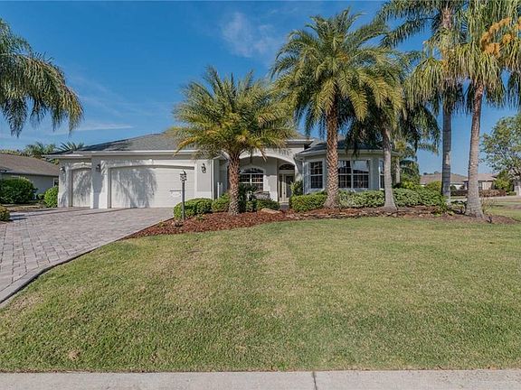 A Beautiful PREMIER home...An Exclusive PREMIER community...A PREMIER location! This SPECTACULAR "WILLIAMSBURG" POOL home in the VILLAGE OF BRIDGEPORT of SUMTER LANDING may be the home you've been waiting for! Situated on an oversized corner lot, this home is inviting from first glance with lush landscaping, paver drive, TANDEM GOLF CART GAR., and a beautiful custom glass entry door. The EXPANSIVE LANAI is perfect for entertaining with a SALT-WATER POOL, PRIVACY LANDSCAPING, FIRE PIT, GRILL & FRIDGE! This Gorgeous home has all you would expect in a PREMIER HOME! The OPEN Kitchen has CHERRY stepped-up Cabinets, GRANITE Counters, Center Island, GAS Cooktop, Lg. Breakfast Bar and a cozy Breakfast Nook. The Master has a TRAY Ceiling, 2 WICs, ROMAN SHOWER plus a JETTED SOAKING TUB. The Dual Solid Stone Counters are accented with COPPER sinks and Custom Lighting. The 2 Guest Rooms are Spacious (one w/Bay window and no closet) and the Guest Bath has Solid Stone Counter, Copper Sink, Tub/Shower and has direct access from the hall and the Guest BR. The main living has HICKORY HARDWOOD Floors w/ STACKABLE SLIDERS to the Lanai, creating a 12' opening! Fridge & Cabinets in the Gar. remain as do All Wall-Mounted TV's. Extras include FRENCH DOORS, ROUNDED CORNERS, LIGHTNING RODS + New Water Heater (1/18). To view Video, click on "tour" button above main photo. Tax line reflects property taxes only. CDD line reflects annual bond $2,486.96, maint. $1,122.37 & fire dist. $124. Bond Bal: 25,598.56.