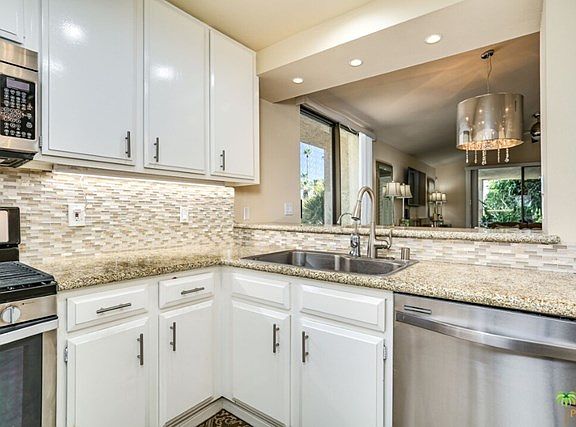 Absolutely stunning! Designer interior - gorgeous!! Three-month minimum lease required. All on one level. Spacious THREE BEDROOM, tile flooring, fireplace, formal dining, granite countertops in the 'gourmet style' kitchen with new cabinetry, new flooring, gas stove, beautiful, custom backsplash. Large outdoor patios both front and back. Master bedroom, large walk-in shower, king bed, patio access. Second bedroom with twin beds, walk-in shower. Corner unit - lots of privacy, 1,700 sq. ft. of gorgeous!! Enjoy the amenities of community pool/spas. Great location, close to Smoke Tree Shopping/restaurant complex. Luxurious resort-style living in the desert for the season. No smoking. No pets.