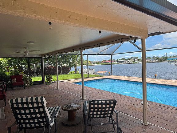 Welcome to Paradise!! The best deal in SE Cape Coral Waterfront homes - and the cleanest home in all of Cape Coral - Mrs. Clean lives here! Updated kitchen and bathrooms - 3bedroom, 2bth, 1964sq.ft, gulf access, salt water pool/spa home on Lido Basin with 700 foot water view. 14 minute boat ride to open water. One bridge 11ft 3inches, the highest in Cape Coral. Two year old premium color metal roof, one year old AC. Over sized driveway with pavers, 2 car garage with extra sq footage for storage, large screened porch, roll down shutters throughout. Assessments for city water, recycled irrigation water and sewer paid. In addition, well water on site to fill pool and wash car. No boat lift but large concrete cantilevered dock and sitting area with fire pit. Kayak and kayak floating dock included.