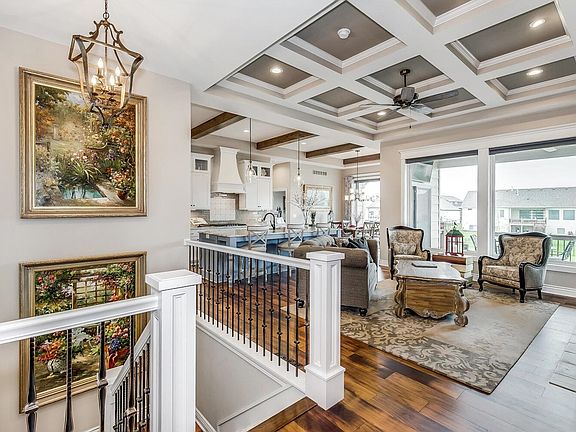 Beautiful custom home on the water built by Craig Sharp Homes. Started in Fall of 2017 and finished in Summer of 2018. Back of the home faces East for morning sun and afternoon shade on the deck & patio. Wrought iron fenced yard with 3 gates. Never had pets, shoes or kids inside. Like new condition. Well and irrigation system with a rain sensor. Custom stone patio with fireplace looking over the water. Shoreline reinforced with rocks. Mature flowering ornamental trees. Driveway has cut curb. 3-car garage with extra 2ft in depth and extra 2ft in width to accommodate a full-sized truck. Garage is insulated & sheet rocked with epoxy floor. HVAC vent heats/cools garage and has a hot/cold faucet in garage. 3rd bay separated for dogs with man door and dog door to backyard. Upgraded furnace to 93% efficiency and 14-seer AC. Upgraded black-frame Anderson windows. Upgraded lighting, cabinets and trim throughout house. 2 wood burning fireplaces with gas ignite. Custom wet bar and wine room. 10ft ceilings upstairs with 11ft treys and 9ft ceilings downstairs. Wood beams and trey ceilings trimmed out. Extra TV outlets in dining and on deck. View-out windows. No egress windows. Hardwood floors in kitchen, dining, living & entry. Tiled bathrooms and laundry floors. Master has makeup counter, crystal chandelier, his & hers medicine cabinets, built-in jewelry box with mirror. Quartz & Granite countertops with 4’x10' oversized kitchen island. Custom blinds and plantation shutters. All kitchen appliances stay including washer & dryer. Double ovens & 36" gas cooktop. Security system. Ring doorbell. Great location in Andover School District near the award-winning Robert Martin Elementary. Feeds into Andover High School. HOA has 3 community pools. Park belongs to City of Andover and has a playground, pickleball court and basketball court. NOTES: Seller is Listing Agent. Seller willing to pay $10k towards buyers closing costs. Quarterly pest inspections and pest applications. HVAC service annually. Last done in Summer of 2023. Deck was last stained in Summer of 2023. Washer & Dryer were new in October 2022.