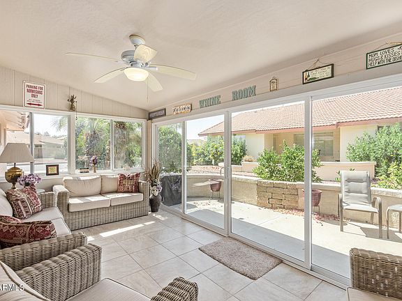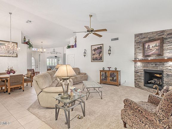 Furnished 2 bedroom & den home nestled on a premium corner lot! The design showcases a great room, adjacent dining area, stacked-stone fireplace, vaulted ceilings, plantation shutters, pot shelves, and built-in bookshelves. The kitchen is adorned with a breakfast nook, bay window and coffered ceiling. New SS appliances, granite counters/backsplash, wood cabinetry, and a breakfast bar complete the kitchen space. Spacious main suite boasts a sitting area and a generously-sized walk-in closet + an ensuite with a walk-in snail shower, tub, & dual sinks. Additional highlights include an Arizona room and an open patio. Located in Sunland Springs Village, a premier 55+ active adult community, residents enjoy access to various amenities. Welcome home