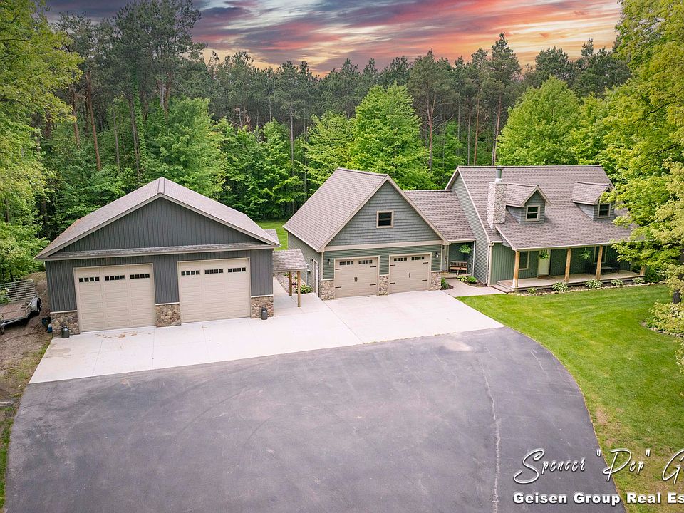 Private wooded setting on just shy of 5 acres is where you'll find this beautiful 3 bedroom, 2.5 bath, 2015 built home offering 2,140 sq' with a rustic interior and an unfinished basement for future expansion. So many features: attractive custom log style interior; front living room with corner, gas log, stone fireplace; private upper level primary suite with 17x19 master plus private bath, WIC and spacious exercise loft area; 26x30 attached garage with spacious full height upper loft, a 4 year new 36x42 pole building with full finished interior including custom 14x18 wet bar with heat, AC and half bath; gorgeous & peaceful backyard oasis including covered patio plus open air patio with bonfire pit; inground sprinkling to the road and porch and patio plant sprayers! This IS the One!!