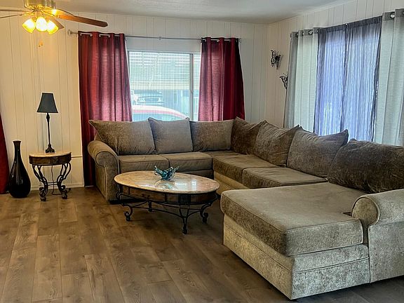 Experience spacious living in this beautifully maintained manufactured home featuring 2 bedrooms, 2 baths, and a den. The home boasts updated flooring throughout and an updated kitchen with modern appliances and finishes—. Enjoy generously sized rooms and baths, along with an inside washer and dryer. Some furnishings are included for your convenience.Relax on the inviting front deck and take advantage of the added storage provided by the carport and storage shed. Located in a 55-plus, age-restricted gated community, you'll have access to a wide range of amenities, including a dog park, putting green, heated pool and Spa