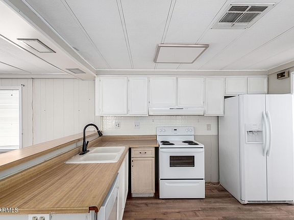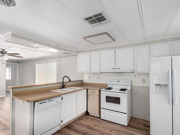 Nicely Remodeled; Explore this charming 2-bedroom mobile home, where comfort and convenience await! Inside, you'll find inviting wood-look flooring and a cozy living room, perfect for relaxing. Practice your cooking skills in the kitchen, which features matching appliances, white cabinetry, and stylish butcher block-look counters, which make meal prep a breeze. Retreat to the spacious main bedroom for a restful night's sleep. A dedicated storage room adds extra functionality. Nestled in a fantastic community with access to a heated pool, spa, fitness center, billiards, putting green and more, this gem is a must-see!