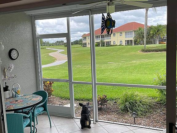 Beautiful first floor end unit with 3 bedrooms and superb golf course views. This spacious condo is very light and bright with easy access. No steps! Both bathrooms have been tastefully remodeled with a double vanity and oversized shower with a bench in the master bathroom. Large walk in closet with built in safe. Eat in kitchen with newer stainless steel appliances. Newly installed waterproof flooring throughout the condo with tile floors in the bathrooms. Screened lanai has electric shutters and the one car garage is oversized with lots of storage. Roof was replaced in 2017. Clubhouse with restaurant, pool, outdoor bar, tennis courts, bocce courts, and golf pro shop. Social membership is included. Equity golf membership is available.