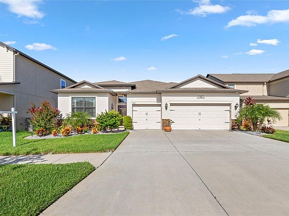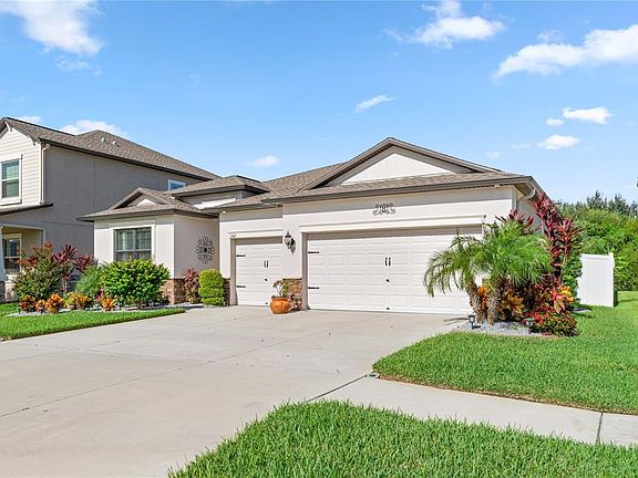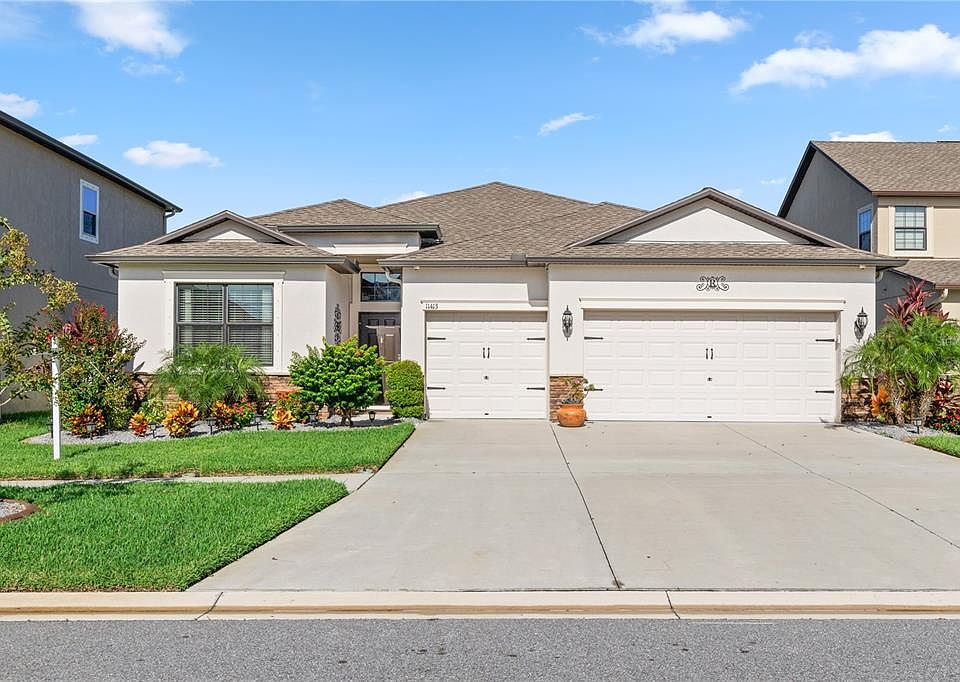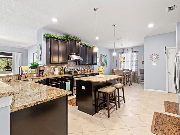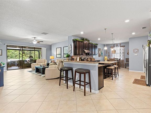 Welcome to your new home, a luxurious haven with a picture-perfect conservation backdrop promising a serene outlook and added privacy! Entertaining will be a joy in the great room with an upgraded barn wood accent wall complete w/a 60" TV. Ceramic tiles flow underfoot into the kitchen where granite counter-tops and coffee colored cabinetry are on show along with a suite of stainless steel appliances. There is a large walk-in pantry with frosted glass door, a designer glass back-splash, vented range hood over the stove, a water filtration system at the sink with bronze fixtures, and a kitchen island illuminated by pendant lights. You can gather with friends in the dining room (currently used as the pool table room) or step out to the covered and screened patio for relaxed entertaining in absolute style. Deluxe oversized fans, pavers and remote controlled sun shades ensure year round entertaining while views over your private outdoor oasis are sure to inspire. Back inside, there are four bedroom with plush carpet including a three-way split bedroom design for guest privacy. One bedroom, with an en-suite bath and closet, is set at the front of the home and there are two more bedrooms and a bull bath in their own wing of the home at the rear. The owner's suite is located on the opposite side of the home and features a huge walk-in closet and a luxe en-suite bath with granite counter-tops, double sinks, a soaking tub and a walk-in shower. The laundry is set off the kitchen, there is also a breakfast nook for casual dining and a door that leads into the attached three-car garage with an epoxy coated floor. Ceiling fans are featured throughout and there is lovely landscaping with concrete curbing and lighting to enhance and complete this impressive property. Built in 2017, you get a newer home with all the upgrades and energy efficiencies...just move on in! (pool table light in dining room does not convey...will be replaced with another fixture prior to closing).