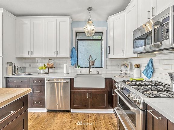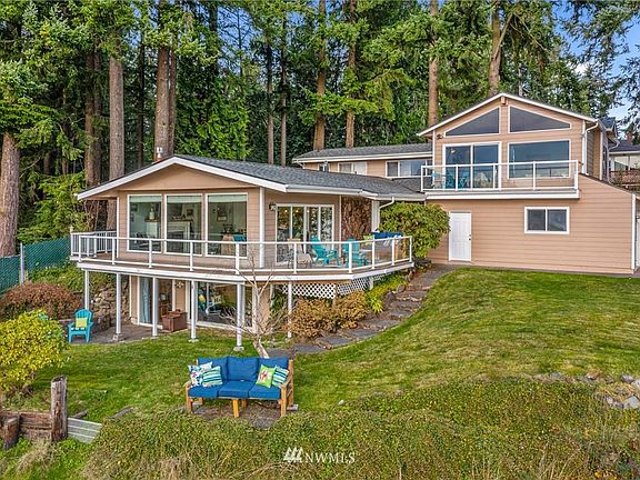 Sweeping views of Silver Lake from all 3 levels - updated Pacific NW home. Floor to ceiling windows in Great Room w/custom tile, mantled gas fireplace, hardwood floors, wrap around deck. Stunning Chef's kitchen w/granite counters, soft close shaker cabinets, subway tile backsplash, S/S GE Cafe appliances (5-burner gas range/double oven), island w/seating, custom cast iron farmhouse sink. Smart thermostats, LED lights, sprinkler & security systems. Master Suite w/gas fireplace overlooks lake w/deck, heated bathroom floor. 2 bedrooms/1 full bathroom on main. Lower family room w/gas stove, patio, bedroom, office, laundry and 3/4 bathroom - possible M-I-L or work from home! Watch eagles soar and otters play! Oversized 3 car garage w/shop and additional off-street parking for 5 cars. New 30 year roof 2020. Entertainer's delight-home for all seasons!