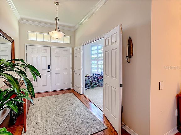 This meticulous pool home is in the sought after gated community of Glenmuir. The home offers an office that can be used as a 5th bedroom. This home is light and bright, neutral paint, wood floors in the main areas, split plan, upgraded kitchen with granite counter tops, breakfast bar, eat in space, island, pantry, open concept to the family room great for entertaining. The family and formal living has relaxing views of the screened in pool area. Family room has 3 panel sliders leading to the magnificent heated saltwater pool and jacuzzi that also features an outdoor kitchen with a beverage fridge, grill, sink, ceiling fans and speakers. Another upgrade is the Pentair PSL4 Control system w/Screenlogic this allows you to manage from smart phone app. Pool views from Master suite, 2 walk in closets, Master bath has 2 vanities, soaking tub and separate shower, other features and upgrades are new carpet and septic drain field both done in 2017, new dishwasher 2018, new Plantation shutters, under and over cabinet dimmable lighting in kitchen, premium and tamper proof switches and outlets throughout, surround sound, smart thermostat, Ring doorbell, termite bond, crown molding, security system with smart app control, beautiful board and batten installed on a wall in one of the bedrooms,newly built shelving in garage offer ample storage, large indoor laundry room, water views of pond from backyard patio. home located on a cul-de-sac road, fruit bearing mango tree, irrigation, termite bond, grade A school district.