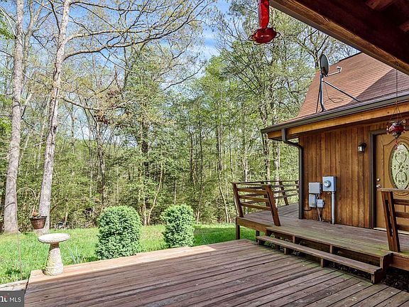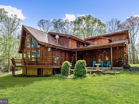 Stunning contemporary home with beautiful wooded views! The entryway welcomes you to the home with separate wood and paved patios- perfect for entertaining. Through the main entrance, the kitchen is warmed by a pellet stove and offers ample cabinet and counter space, stainless steel appliances, and a breakfast bar area. The spacious family room is showcased by stunning floor to ceiling windows accentuated by a cathedral style wood ceiling. The main level bedroom or office and full bath conclude the main level floor plan. Ascend upstairs to the gracious master suite highlighting a wood beamed ceiling, an en-suite bath, and views overlooking the rear yard. The home also boasts a two-car garage with upper level awaiting inspiration as an apartment, playroom or additional storage. Enjoy the sunset from the comfort of your expansive wraparound deck overlooking the large rear yard that backs to a beautiful wooded view.