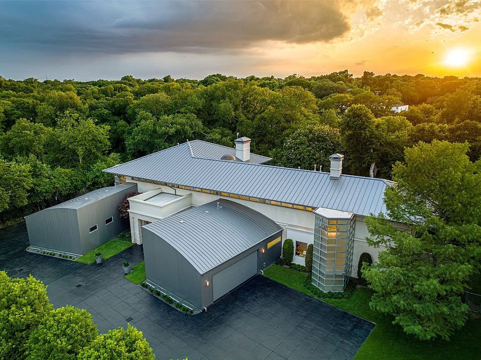 This North Dallas contemporary home designed by architect Charles Fisk is brimming with special details. The 6,728 sqft residence boasts 4 beds, 4.1 baths, a game room, a media room, multiple balconies, and a meticulously landscaped 1.278-acre lot. The first level’s unique architectural dining room with a circular mahogany exterior and the spacious living room with a striking fireplace offers a grand place to entertain. The sleek kitchen features black granite counters, maple cabinetry, and limestone floors. Upstairs the primary is a serene oasis with treetop views, a covered balcony, and light-filled bathroom with heated tile floors. In the backyard, find a large patio with a built-in grill and fire pit. The sparkling pool features a hot tub and waterfall. In addition to the 4 garage spots, a paving unit with special irrigation that is found under the grass creates more guest parking. The architecture blends seamlessly with the meticulous grounds, creating an entertainer’s dream.