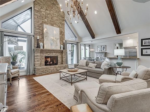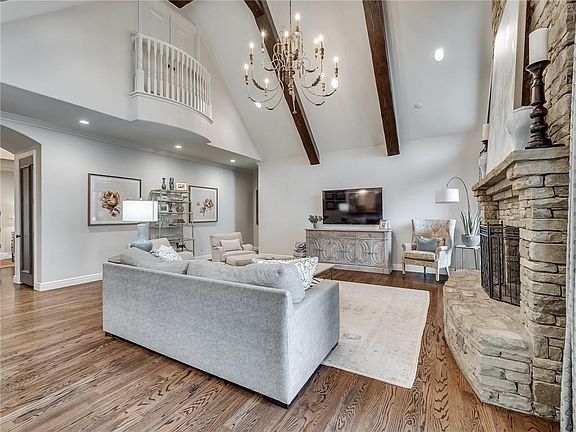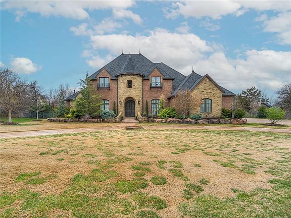 This 1.74 acre oasis including circular drive, gas lamps at entry, pool, hot tub, waterfall, beautiful trees including cherry, pear and peach trees and a Generac generator will have you in awe of its beauty and amenities. Enter the double doors to oak floors and updated paint throughout the home. Look up at the cathedral ceiling of the living room and take in the beauty of 200 year old wood beams from Virginia and follow the stoned gas log fireplace. The kitchen provides updated natural quartz countertops, instant hot water, subzero refrigerator, Wolf gas range and Bosch dishwasher, double ovens, warming drawer, microwave oven and trash compactor. The butler's pantry includes water for coffee maker, wine fridge, drink fridge and ice machine. Master bedroom opens to a screened patio. The master bath floor is Travertine tile and heated. All bedrooms have a full bath. Observatory located on the 3rd floor provides view of Devon Tower and north to Guthrie. Additional description in photos.