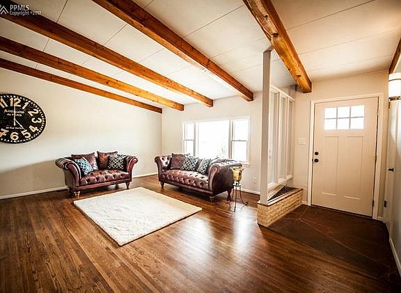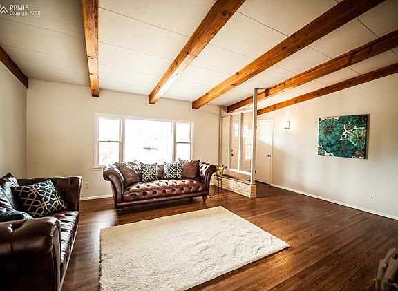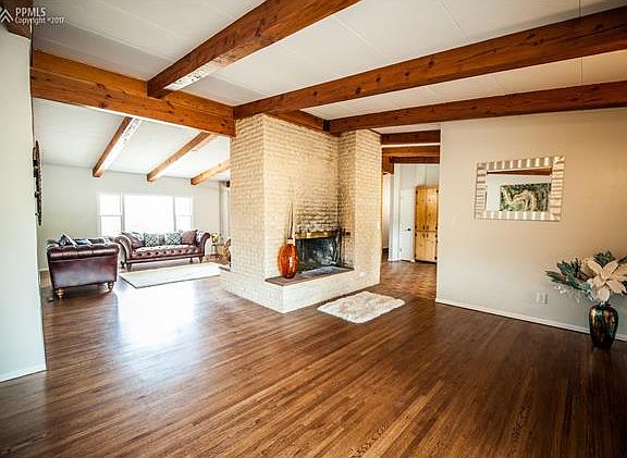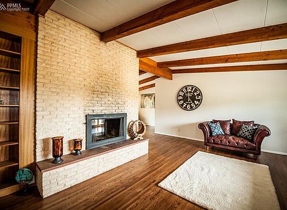 Close-in location in sought after SW Black Forest on over 3 acres! Remodeled midcentury modern rancher with all square footage on one level! Vaulted exposed wood beamed ceilings throughout entire home. Refinished glowing hardwood floors throughout the majority of the main level. Spacious great room with large windows, built-in bookshelves and a double sided wood fireplace. Freshly painted interior and exterior. Smaller barn/workshop/storage shed with fenced meadow. New light fixtures and front door. Zoned for horses. Over three acres partially treed and partially meadow. Greenhouse with electric, water and heater. Spacious kitchen with built-in grill and hood vent, slab leathered granite counters, tile backsplash, stainless steel appliances and original cabinetry! Walk-out dining room with double sided fireplace and hardwood floors. Large stamped and stained concrete patio. Fenced backyard area. Newer roof, furnace, hot water heater, septic from 2010 and upgraded Pella sliding door. Close-in location - only 3.4 miles from Black Forest Road and Woodmen!! Award winning District 20 Schools! NO HOA.