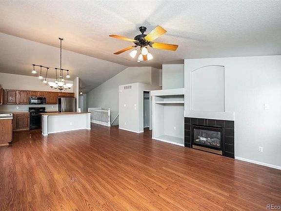 This Commerce City one-story home offers vaulted ceilings, a fireplace, a kitchen island with breakfast bar, an office, a master bath separate tub and shower with dual sinks, an open patio, and a two-car garage. This home is vacant and cleaned regularly.