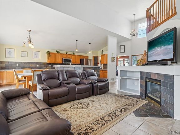 Set on a large corner lot with mountain views, this spacious six-bedroom, four-bathroom home in Commerce City features a flexible, open layout designed for comfortable living. The kitchen includes granite countertops, stainless steel appliances, extended cabinetry, and flows into the dining area and family room with soaring ceilings and a fireplace. A second dining or flex space just off the kitchen adds versatility. The main floor hosts a private primary suite with a five-piece bathroom and walk-in closet. Upstairs, a loft and three more bedrooms create room for everyone, while the finished basement adds a large recreation room, two bedrooms, a bathroom, and extra storage in the lighted crawl space. Step outside to a generous backyard fully enclosed by a 6ft wood fence, with a 4ft fence along the side of the house. An extended patio, a spacious gazebo, and a storage shed create the perfect setting for gatherings, hobbies, or quiet evenings. With walking trails, open space, and everyday amenities just minutes away, this home pairs abundant living space with a scenic and convenient setting!