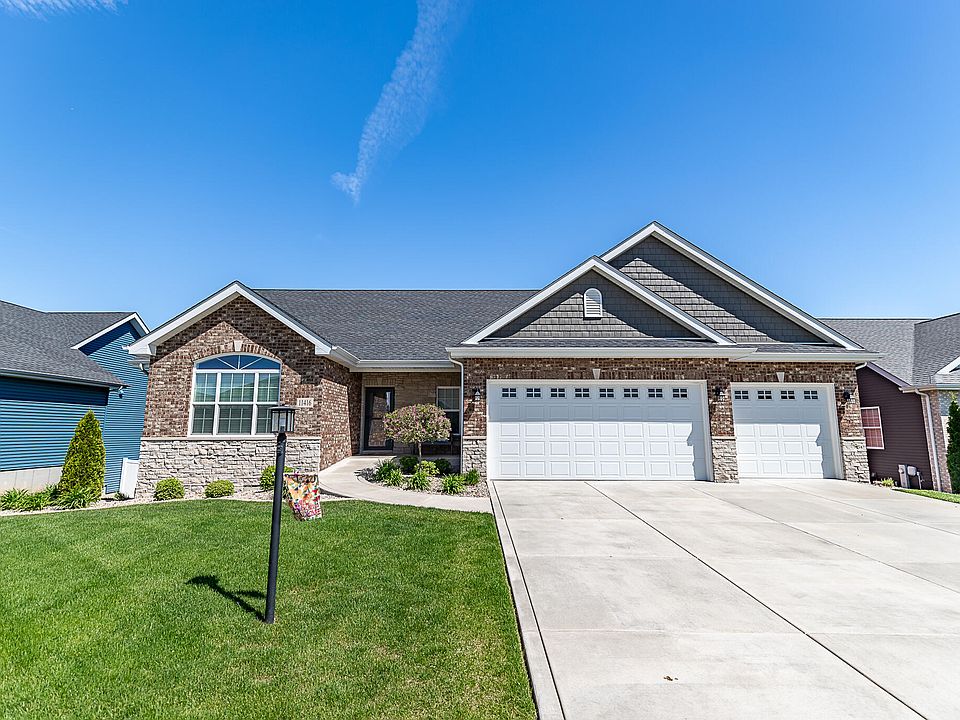 Step right up to this stunning ranch-style beauty! Picture-perfect with a walk-out lower level and not one, not two, but four cozy bedrooms awaiting your embrace. The moment you set foot through the brick and stone entry, you're greeted by a warm embrace of hardwood flooring, stretching throughout the open-concept kitchen area and living room. Get ready to be swept off your feet by the spaciousness of the main floor, boasting a generous 1890 square feet of finished space. Check out the cathedral ceilings and fireplace in the living room - they're the cherry on top, adding an extra touch of elegance and warmth to your sanctuary. Say hello to your new favorite kitchen, adorned with sleek quartz countertops that make cooking a breeze along with a barn door pantry. When it's time to soak in some sunshine, just glide through the sliding glass door onto your very own Trex deck, offering a bird's-eye view of your sprawling backyard oasis. Retreat to your primary bedroom on the main level, where heated floors in the bathroom transform every morning routine into a spa-like indulgence. Bedroom 2 beckons with its ceiling fan, walk-in closet, and hardwood floors, while the third bedroom boasts a vaulted ceiling and another charming ceiling fan. Brace yourself for 1300 square feet of finished lower level bliss! Discover yet another primary suite, complete with a shower and heated porcelain floors that will make you feel like royalty. When it's time to entertain, the spacious family room is your ultimate host, with a nearby patio perfect for alfresco gatherings. Did we mention the concrete driveway leading to your three-car garage? Because parking has never been more stylish! With a brick front exterior and vinyl siding wrapping around the sides and rear, this home is a true gem, just a stone's throw away from the border of Illinois, bustling shops, mouthwatering restaurants, and convenient close to routes 41/30.