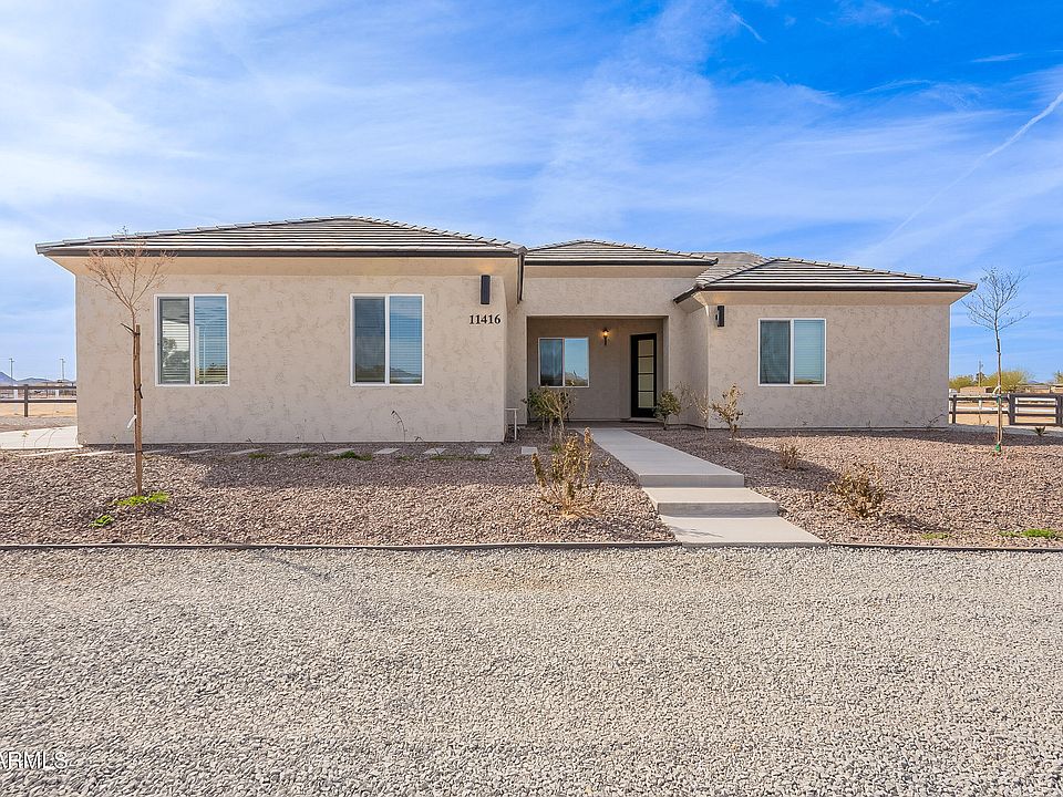 Welcome to this exquisite 4-bedroom, 3-bathroom home in the heart of Buckeye, offering a perfect blend of luxury and comfort. This spacious residence features an open floor plan, ideal for modern living and entertaining. The gourmet kitchen is a chef's dream, boasting custom-made white cabinetry with elegant gold handles, ample storage space, and sleek countertops. A wet bar with a mini fridge adds a stylish touch, perfect for hosting guests. Throughout the home, beautiful tile flooring enhances the sense of sophistication and durability. Each bathroom showcases stunning tile work and gold fixtures, adding a touch of elegance to your daily routine. The huge main bedroom is a private retreat, featuring a massive walk-in closet with plenty of storage. A junior suite with its own private bathroom ensures comfort for guests or family members.