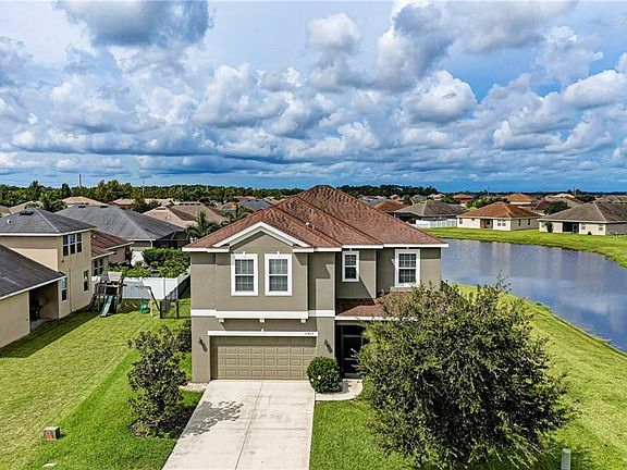 One or more photo(s) has been virtually staged. Gorgeous 4/3 with a den and huge bonus room that is located in a gated community on an oversized - fenced lot with pond view. Home has been prepared and painted inside and out so you don't have to. Kitchen has dark cherry cabinets, granite countertops, corner pantry and a center island overlooking the great room. There is a den, guest room and full bath on the first level of this home. Great room is equipped with surround sound speakers. The upstairs has another entertaining space with a large bonus room that can easily become a theatre room or game room. All bedrooms upstairs are spacious and guest rooms have a bathroom between them. The laundry room is located upstairs for ease and convenience with included front load washer and dryer. Community offers clubhouse, resort style pool, fitness center, playground, sports court and one more pool in phase 2. HOA FEE includes basic cable and internet and community also has reclaimed water. New elementary and high schools opened last year and are just outside of the community which makes Copperstone a great choice.