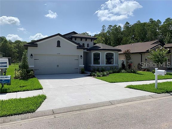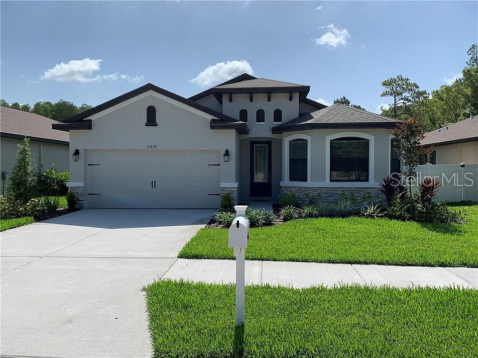This single story split floor plan has four spacious bedrooms, three baths, and a two car garage. Fourth bedroom has its very own bathroom making it a great option to be used as a study, guest room or mother-in-law suite. Kitchen offers 42" cabinets with crown molding, cozy breakfast nook, and breakfast bar. Kitchen looks out onto a separate dining room area and large family room. Master suite includes large walk-in-closet, dual sinks, and garden tub with a separate shower. The Genova floorplan offers oversized colonial baseboards, Moen ® plumbing fixtures, energy efficient appliances, covered patio area, and an award winning Jack and Jill bathroom. Upgrades for the home include quartz countertops throughout the whole house, tile in the main living area, and upgraded stainless steel appliances. Low HOA and no CDD!
