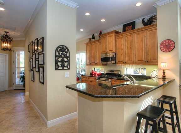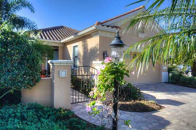 From the moment you enter the wrought iron front gate to this absolutely perfect, maintenance free home you will be impressed with the quality and thoughtful selection of upgrades chosen by the original owner. This home has a fresh look with crown molding, volume ceilings, solid wood cabinets, cambria countertops, stainless steel appliances, plantation shutters and custom-made draperies. The open floor plan with 2 bedrooms, 2 bathrooms, den, and breakfast nook provides a spacious feel. You will enjoy living two doors away from the community pool, spa and outdoor kitchen area. This Neal home is located in Wexford of Lakewood Ranch Country Club West conveniently located near shopping, dining, golf courses, sporting activities and LWR hospital.