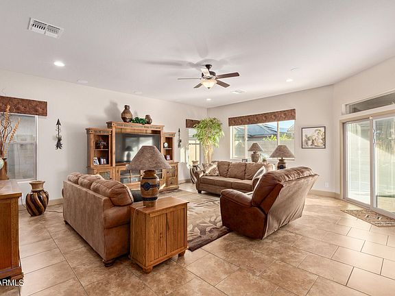 Discover the allure of this beautiful home in the 55+ Community of Sunland Springs! Displaying a 2-car + 20' golf cart garage, striking stone accents, a front patio, & a desert front yard w/an artificial turf. The immaculate interior boasts a captivating open layout bathed in natural & recessed lighting, making entertaining a bliss. 10' ceilings, soothing paint, and tile flooring are features worth mentioning. The kitchen is equipped w/granite counters, floor-to-ceiling wood cabinetry, a handy pantry, a stylish tile backsplash, & an island w/a breakfast bar. Retreat to the main bedroom, offering a sitting area w/outdoor access, a private bathroom w/dual sinks, a glass block shower, & a walk-in closet. Relax as you enjoy the mountain view from the front patio. Enjoy alfresco dining in the expansive backyard w/a screened-in patio & Travertine tile floor! What's not to like? Make this gem yours now!