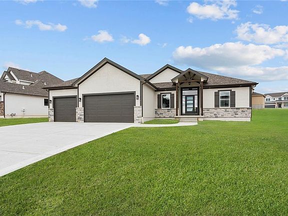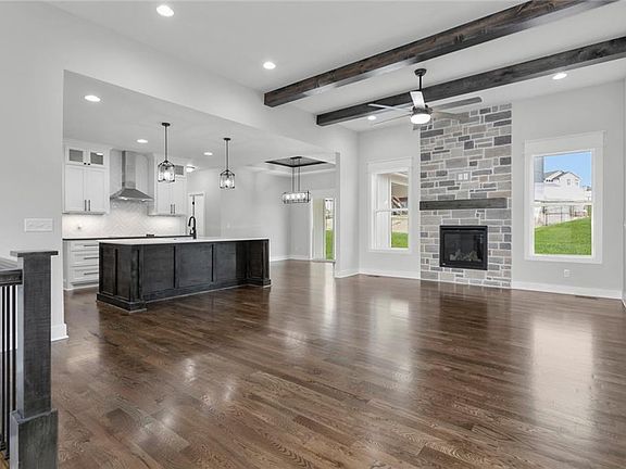 True Ranch style home!  Step in to an open floorplan with lots of light and space all on the main level!  Kitchen has granite island with large walk-in pantry and tons of cabinets.  Beautiful hardwood flooring extends into Dining/Breakfast area surrounded by windows & trimmed with beautiful beams in vaulted ceiling.  Custom stone Fireplace is the centerpiece of the Great Room with stained beams ceiling detail. The Primary Suite is tucked behind the Great Room for privacy from secondary bedrooms.  Gorgeous beamed details in ceiling with barn door to Primary Bathroom featuring double vanity, jetted tub & tiled shower plus large walk-in closet. Other 2 Bedrooms located on main level on the other side of home with tiled full size bathroom nestled between. Covered patio located in back. Basement is unfinished for massive storage space or your future next level plans.