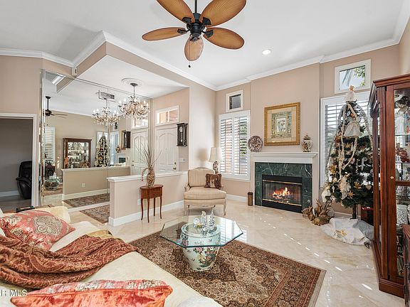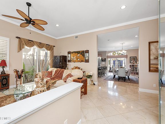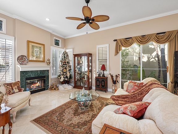 The exterior is equally captivating, with meticulously landscaped grounds adorned by blossoming flowers, graceful canopy palms, and a serene backyard oasis featuring a relaxing water fountain—a tranquil retreat for relaxation or entertaining. Nestled directly across the community gates to the Spanish Hills Country Club in a golfer's paradise with three prestigious golf courses nearby, this detached residence offers the allure of low HOA dues and unparalleled convenience, with proximity to Camarillo Airport, the 101 Freeway, fine dining, upscale shopping, and the pristine beauty of state beaches. This extraordinary home is an invitation to claim your own slice of paradise.