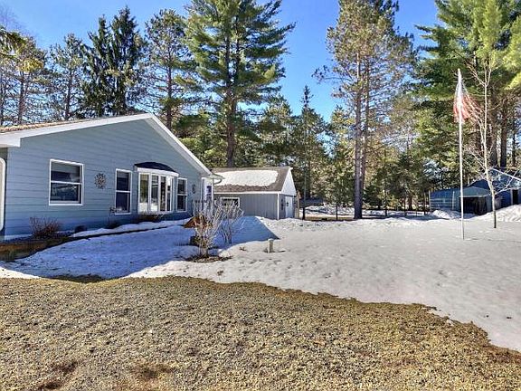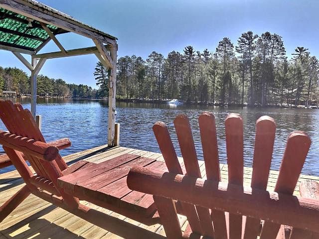 EAGLE RIVER CHAIN Wow! What a view - summer or winter! Main floor living & extremely level grounds make this waterfront home easy to access & maintain. Features a huge living room with wood-burning field stone fireplace, a sun room & multiple closets including a 5'x10' walk-in. Excellent views of the water from the master bedroom, kitchen, sun room & the living/dining room. Bedrooms 2 & 3 are on each end of the home for a very private & livable design. A paved driveway, lush lawn, beautiful landscaping & a concrete walkway welcome you. Includes 2 permanent piers, a covered boat slip, manual lift for a 16' boat, power at the dock, 2 garages, a shed, a big sun deck & a fire pit. Did I mention the pier is perfectly level with the yard? The Eagle River has a sand bottom shore here, rock rip-rap, & is navigable in both directions toward Watersmeet Lake to the west & Yellow Birch Lake & the rest of the Eagle Chain to the east. Only 2 miles from downtown Eagle River.