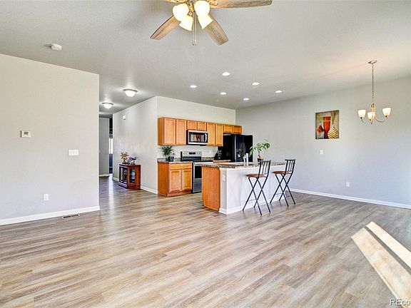 Come see this beautifully finished home in the desirable Autumn Valley Ranch community! This move-in-ready residence features an open, light-filled interior with brand vinyl flooring throughout. Two spacious and sunny bedrooms with recently installed carpet at the front of the home offer wonderful privacy and are separated by a full-size bathroom. Access to the attached two-car garage and the laundry room is just off the kitchen. The kitchen has granite countertops, high-end appliances, modern wood cabinetry, and a kitchen island with seating. The dining room off the kitchen features access to the patio through sliding glass doors for indoor-outdoor living! The living room spills seamlessly into the kitchen and dining areas ensuring this floor plan is perfect for entertaining. The primary bedroom suite is on the other wing of the house with an upgraded vanity, shower and a spacious walk-in closet. Outside, enjoy your the fully-fenced backyard and newly installed dog run. The location can’t get any better as you’re close to shopping, dining, parks, and more! Hop onto I-25 for an easy commute to Denver, Boulder or Fort Collins. ***This home qualifies for $0 down USDA loan***
