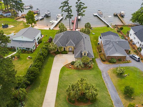 As spectacular as this 3BR/3BA home with FROG and formals is, it is the outdoor living spaces that seamlessly blend the home with the lake which set it apart and makes it truly unique. The five mile view of the big water all the way to the dam does not hurt either! The outdoors include a covered porch with stone patio, built-in grill, fire pit, paver patio, pergola and landscaping that will blow you away. Your private dock sports a 10,000 lb boat lift, sitting area and steps to the water and sandy beach. There is also a resident heron to add to the ambiance. Inside, the split floor plan ensures privacy while the open floor plan maximizes the magnificent view! Architectural features abound like arches, columns, volume ceilings and travertine floors giving it a "Florida-esque" feel. This one has been meticulously maintained and is ready for your furnishings. It will not last and cannot be reproduced at this price. So, you better hurry!