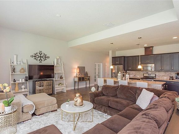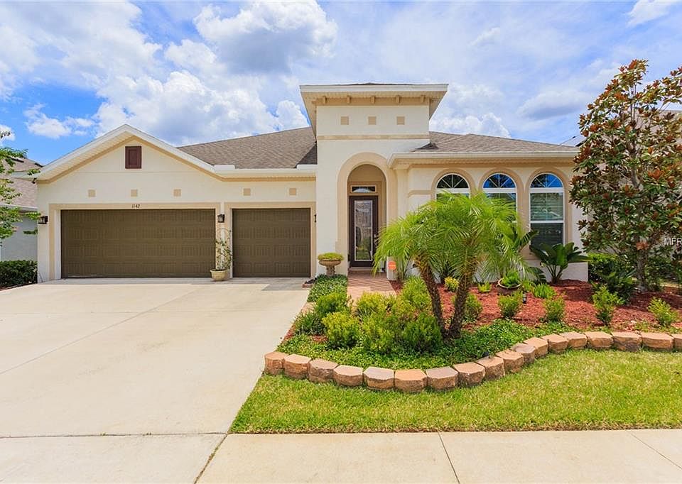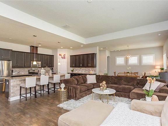 **NO CDD FEES** Gorgeous David Weekley built home located in gated "Reserve At Hunters Lake" - 4 bed, 3 ba, familyroom, dining area, huge kitchen, office/den & 3 car garage. This is a small private community nestled by Long Pond Lake w/ easy access to all major highways & shopping. Offering a large open floor plan for GRAND entertaining! Upon arrival notice the beautiful landscape, curb appeal & upgraded glass w/iron accent front door. Once inside you are greeted by espresso hardwood flooring throughout the main living areas. The familyroom is enormous w/four sliders leading to covered lanai. The kitchen is stunning w/42" espresso cabinetry, stainless steel appl, Santa Ceilia granite countertops, brick lay stone backsplash & around kitchen island, walk in pantry, plenty of counter space & cabinetry, and snack bar for extra seating! There is a roomy dining area for the largest of tables. The owner's retreat is grand w/large walk in closet. The masterbath offers granite countertops, his & her sinks, garden tub & spacious shower. There are two spacious secondary bedrooms that share an upgraded bath & a 4th bedroom suite w/its own private bath & walk in closet. There is a separate french door office/den with hardwood flooring. Plenty of windows & tall ceilings make this home light & bright. Bonuses/extras: plantation shutters throughout, tray ceilings, upgraded fixtures & lighting, folding table in laundry, in wall pest control system, alarm system & more! Don't miss this one!!