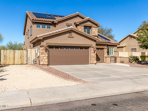 Experience the comfort this energy-efficient home that comes equipped with Solar, 4-bed, 3.5-bath, 3 car garage, RV gate, pool, and 10k+ lot that offers the perfect AZ backyard! As you enter, you're treated with stone accents, & private courtyard. Inside, the inviting great room sets the tone for a cozy living experience, complemented by wood-look tile flooring & sliding glass doors to the back patio. Highlights include stylish light fixtures, freshly painted, plantation shutters, & a bright den/office. Open-concept kitchen boasts white cabinets & cupboards w/crown moulding, granite counters, a pantry, subway tile backsplash, built-in desk, SS appliances, & an island w/a breakfast bar. HUGE main retreat stands out! Brand new plush carpet, outdoor access, an ensuite w/dual sinks, garden tub, & a walk-in closet complete the picture. Large loft w/balcony access & bonus room have endless possibilities! Finally, the serene backyard oasis provides a covered patio, travertine, brand new turf, and a crystal-clear pool with rock waterfall. This dream home awaits you!