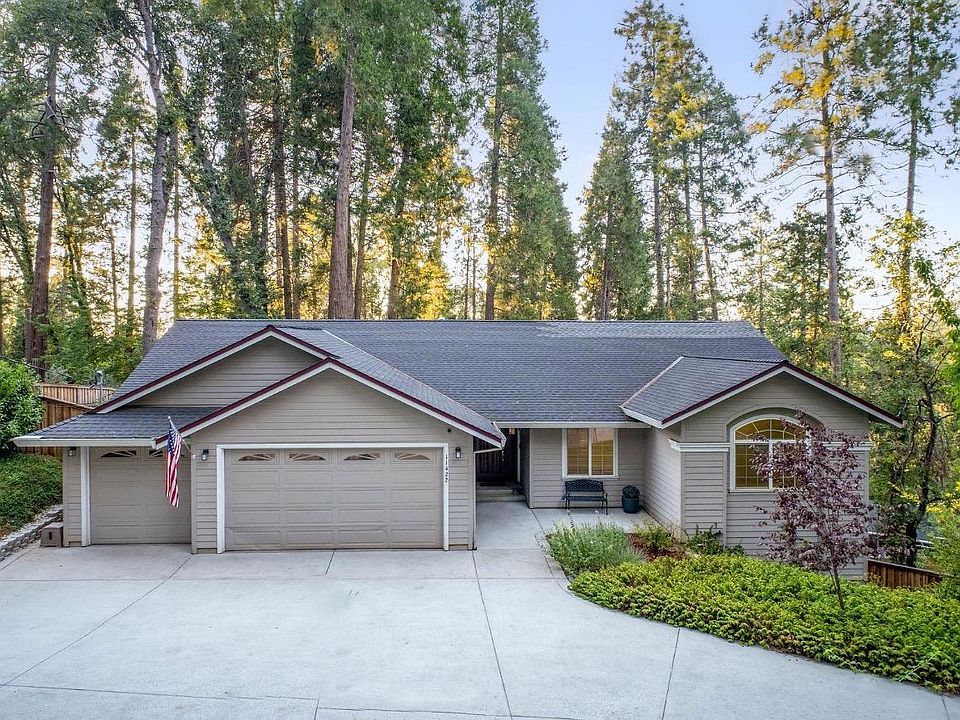Custom, single-level and move-in-ready home on a quiet street in desirable Timber Trail Estates, just minutes to downtown Nevada City or Grass Valley! Beautiful 3 bedroom, 2 bath home with a 3-car garage, fenced backyard and circular drive. Treetop living with lots of windows and filtered, long-range VIEWS! The living room features a gas log fireplace, vaulted ceilings and a formal dining area. The cook's kitchen has plenty of counter and storage space, granite tile counters, stainless appliances, a breakfast bar, a pantry closet and an informal dining area that opens to a covered porch. The comfortable master suite features vaulted ceilings, a large walk-in closet and a bath with a walk-in shower. Enjoy the private, fully fenced back yard with flagstone patios and a mix of trees. Additional features include: recently painted inside, low-maintenance landscaping, central heat and air, public water, natural gas, a blue-tooth thermostat and a security system. High-Speed Internet available!