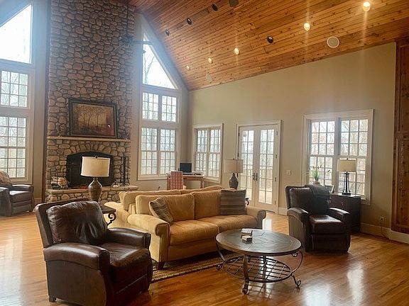 Rare Opportunity to own a 113+ acre estate near Nashville and only minutes from I-40. Perfect for everyday or part living. Here you can enjoy boating, fishing, & hunting all in one location. Home is complete with expansive outdoor living space, vaulted ceiling in great room, gourmet kitchen, sunroom & more!. MB is on main. 2 BR upstairs and a fully finished basement with full size kitchen & BA - Lots of space for expansion if needing additional bedrooms. Furnishings can be purchased separately