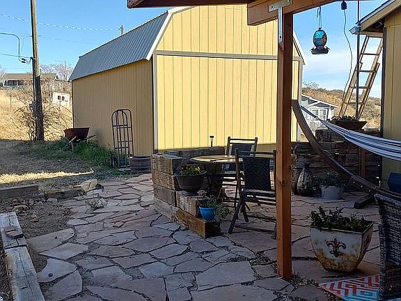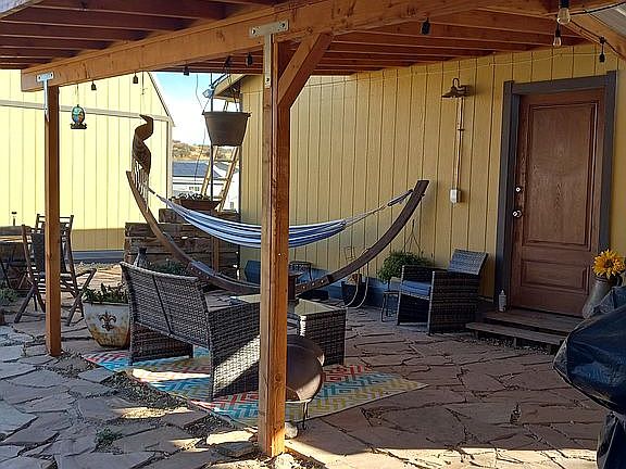 This is a unique set up. There are 3 little houses on 1.75 acres. The main house is 700 sq. ft. and there are 2, 400 sq. ft. studios currently rented on a month to month. There are 4 of private outside areas one with private jacuzzi. Also a 12 x 32 ft barn like shed used as garage and storage. The 2 studios are one upstairs the other downstairs of a separate building connected to main house by beautiful wooden structure with tin roof shade area with flagstone floor with enclosed outdoor laundry area. Both studios have full baths and kitchens. There is a huge circle drive through area with two gates one on each side of property. Property has 450 ft well not in use at the time. 3000 gallons of water storage. Property has wonderful views of the Bradshaw and Mingus mountains, National Forest, and backs to the BLM. Enjoy the quiet time and privacy with unique rock work, open patio, mature trees. This is a must see set up.
