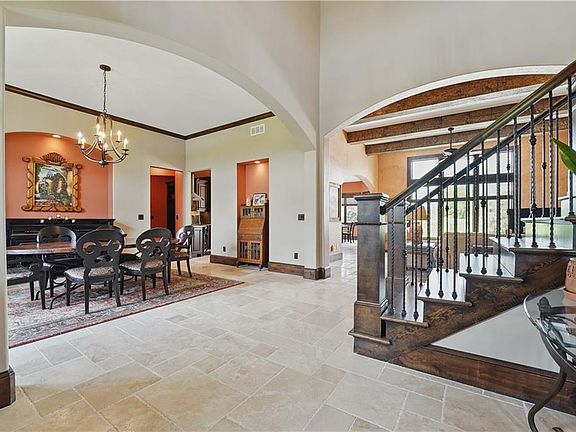 Welcome to your dream home! This stunning 5-bedroom custom-built ranch offers 3,509 sq ft of refined living space, nestled on a picturesque 10-acre lot just outside city limits—giving you the perfect blend of privacy and convenience. This Mediterranean-style home with tile roof and stucco exterior offers serene views, luxurious living, and space to spread out both inside and out. The craftsmanship shines with high-end finishes throughout, including rich travertine tile flooring in the main living areas and rustic alder cabinets and doors! The heart of the home is the expansive chef’s kitchen, featuring two islands, prep sink, gorgeous granite countertops, high-end Bertazzoni gas range, and spacious walk-in pantry. The breakfast room boasts a wall of windows with peaceful views, bringing natural light and serenity into your mornings. Perfect for entertaining, the home also offers a formal dining room and a spacious great room with exposed ceiling beams and a floor-to-ceiling stone fireplace. Enjoy the loft area above the entry that overlooks the front acreage and pond—ideal for reading, relaxing, or working from home with a view. The luxurious primary suite includes a spa-like bathroom with dual sinks, a separate makeup vanity, jetted tub, tile shower and a generous walk-in closet. The laundry room with sink and built-ins is accessible from closet or hallway. Car enthusiasts and hobbyists will love the five garage spaces, including a two-car lower-level finished garage with an upgraded polyurea-coated floor—plus a massive unfinished basement offering endless possibilities for expansion. The backyard has wrought-iron fenced area and nice patio for BBQs. Enjoy the great outdoors with your own stocked pond and wide-open spaces. The 27-acre Peculiar City Reservoir is across the street for more fishing options. Located just a short drive to town, yet a world away from the bustle, this exceptional property offers the privacy and luxury you've been waiting for.