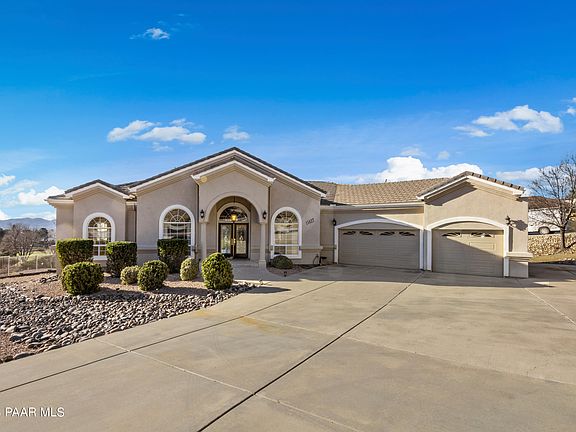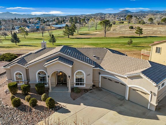 Grand Contemporary home sitting on the 8th Fairway of the Prescott Country Club Golf Course. This home offers tremendous views of the golf course and Bradshaw Mountains. The interior features a beautiful stone fireplace, formal dining area, breakfast nook and island kitchen. The master has a large walk-in closet and ensuite bath with soaking tub and walk-in shower. Enjoy a spacious 3 car garage, circular driveway for ample parking and a concrete RV pad with hookups. Capture the stunning views from the back covered deck and enjoy the AZ weather!