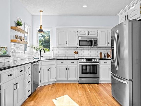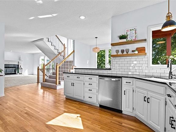 Welcome Home to this Gorgeous 2 Story in Overland Park with Bright Open Floorplan! Situated on a Coveted Cul-de-sac lot that backs to the awesome Neighborhood park! Spacious Kitchen features Granite counters, newer Stainless steel appliances, newer plumbing and lighting fixtures and opens to the breakfast room and Great Room! Just LOVE all this natural light! Beautiful newly finished Hardwoods, Spacious Great room with Fireplace. Built-in Desk/Beverage center between Kitchen and Great Room Perfect for entertaining! Formal Dining Room or Office! Darling Half bath. HUGE Master Suite with Sitting Area and Martini/coffee deck! Master bath offers tiled Shower and Fantastic walk-in closet. Tiled Laundry Room on 2nd level. Bedrooms offer Walk-in Closets, Newer carpet and paint! Updated Baths with Double Vanity and Tile floor and showers! Fresh paint, newer flooring, newer plumbing and light fixtures. Daylight Basement partially finished and STUBBED for bath. NEW DECK INSTALLED! Awesome Community Pool. So much to LOVE! Must see!