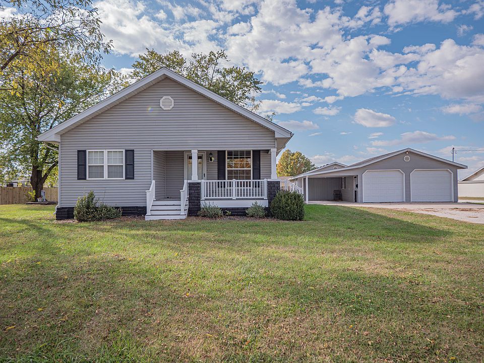 This charming 4-bedroom, 2-bathroom home is nestled just outside the city limits on a blacktop road. The property boasts a spacious 2-car detached garage (24x36) with a lean-to and 2 additional storage rooms. There's also a second detached garage (28x40) for ample storage and workspace. A privacy fence surrounds the property, ensuring seclusion and security. In 2009, the home underwent a complete remodel, which included updating all electrical and plumbing systems. This property combines modern amenities with the serenity of country living, making it a perfect haven for those seeking comfort and work space.
