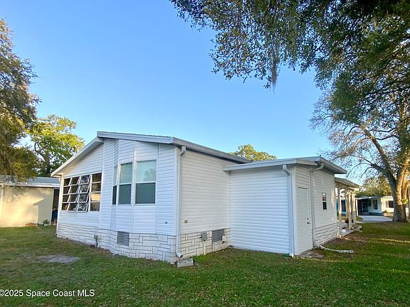 FINANCEABLE & INSURABLE 2BR/2BA IN 55+HOLIDAY PARK! LAND IS OWNED! The original owners lovingly maintained this Homes of Merit DOUBLEWIDE. Featuring a spacious eat-in kitchen w/ good cupboard space & a large walk-in pantry, a huge living room & dining area, a sizeable master bedroom w/ a large walk-in closet & a dressing area w/ double sinks separated from the bathroom & shower. The split-bedroom design has a guest bedroom in the front portion of home & more closet space. A same-level Florida Room was built w/ the home & has air/heat. One of the few homes in the community to have a side by side double driveway, so car jockeying is not a problem at this home. A covered patio leads from the driveway to the outside utility shed that has the washer/ dryer. The carpet has been removed & vinyl plank flooring is being installed.Located on a quiet cul-de-sac & within 1 mile of restaurants, groceries, pharmacies, banks & I-95.