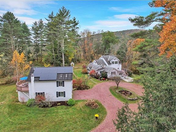 Come see this beautiful 6.4-acre country retreat in a picturesque setting only a few minutes drive to the center of Poultney - a quaint Vermont town close to excellent mountain biking, hiking, and skiing. The main home is dominated by a large dining room/living area that spills out through sliding glass doors to a wrap-around deck overlooking a picturesque brook and forested hills beyond. The modern kitchen is ample and outfitted with high-end custom cabinetry. Upstairs, the spacious primary bedroom suite is bright and exquisitely designed with a deep walk-in closet, newly renovated bathroom, and large sitting area. A second bedroom/study, with its own private full bath, is located on the first floor. With a large carriage house and separate garage with bonus room (artist studio or bar), this property is big enough to accommodate an extended family or create additional income from rentals. The carriage house includes a two-car garage and work bench area on the first level, and a studio apartment with open kitchen, living area, bedroom area, bathroom, and deck on the second level. Upgrades to the property include solar, Tesla battery whole house backup system, renovated bathrooms, newer furnaces, hot water heaters, and much more. Don't miss the opportunity to own this unique and beautiful property.