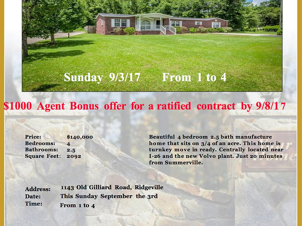 This 2092 square foot mobile / manufactured home has 4 bedrooms and 3.0 bathrooms. This home is located at 1143 Old Gilliard Rd, Ridgeville, SC 29472.