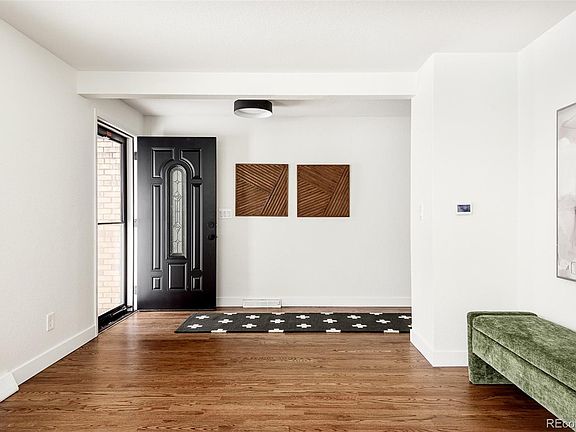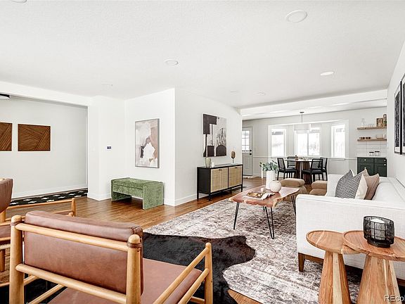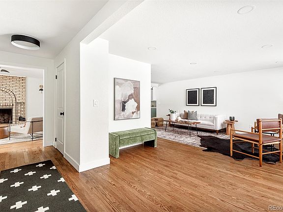 Discover modern tranquility in this fully remodeled 4-bedroom, 3-bathroom ranch-style home in the sought after Broomfield Country Club Estates neighborhood. The thoughtfully designed interior features an expansive living area with gorgeous new hardwood floors and a main floor layout that is convenient for everyday living. The galley kitchen is adorned with calacatta gold quartz countertops, high-end black stainless steel appliances, two-toned semi custom soft close cabinets, and open shelving. The sitting room connected to the kitchen and eating area has so much character and charm with built in bookshelves, mid-century modern light fixtures, and a gas fireplace.