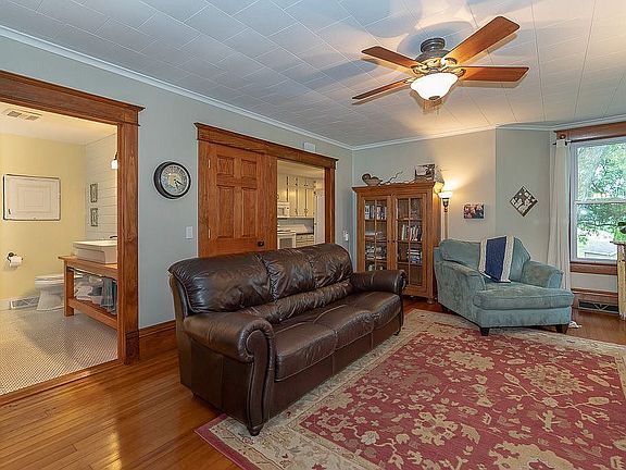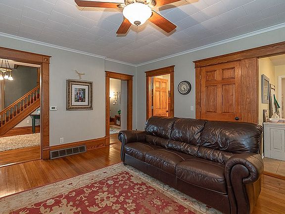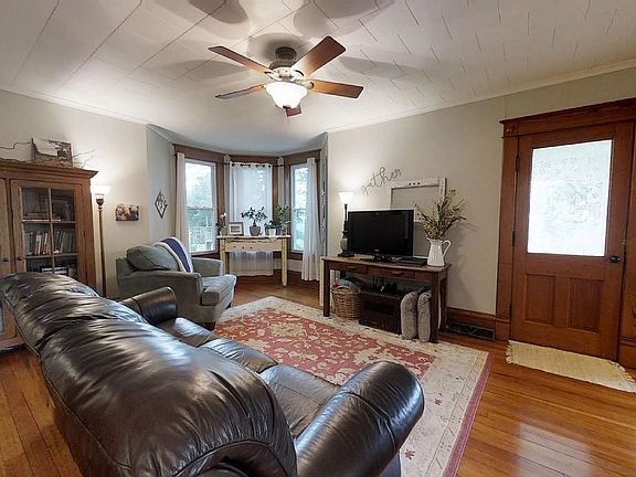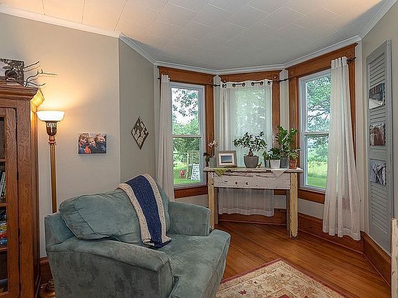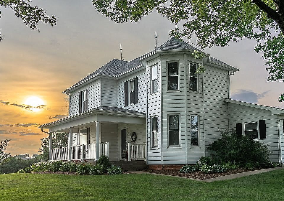 Sophisticated farmhouse, meticulously maintained, situated on a hilltop surrounded by a serene 1 acre setting & AMAZING views! Welcoming covered front porch leads to LR w/exceptional sunlight & soaring tall ceilings. Kit. features tile flooring w/lots of cabinetry space & appliances. Large dining rm w/BRAND NEW sliding glass door. Two main level bonus rooms, one of which could be used as a main level bedrm. Open staircase leads to 3 upper level bedrms w/new carpet '20. Sizable primary bedrm w/deep closets
