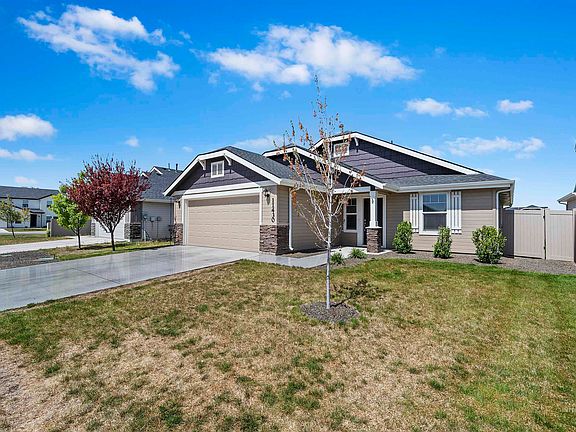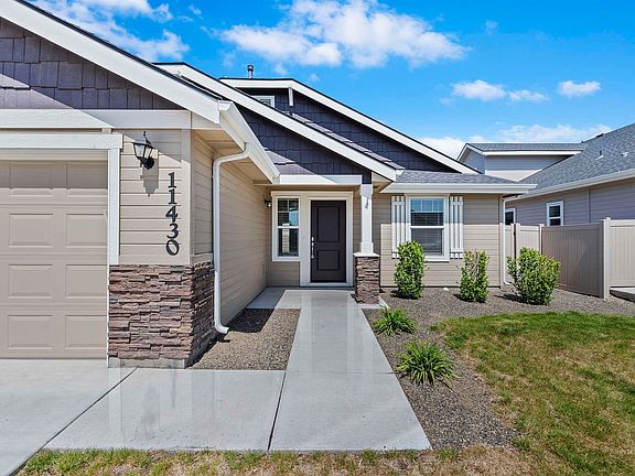 Move-in ready - don't miss out on this one! Hubble Homes popular Alturas floor plan. This inviting single-level home features a desirable split bedroom design floorplan that gathers at the kitchen & blinds throughout the home. You'll enjoy the chef's kitchen with quartz countertops and plenty of storage with all appliances included! This home offers 3-bedrooms, 2 bathrooms, 1447 square feet of modern living space with an open concept design, home is in the desirable Sunnyvale Subdivision! Built in 2021! Enjoy seamless entertaining in the spacious living room with luxury vinyl plank (LVP) flooring throughout the main living areas. The primary suite offers a walk-in closet & dual vanity. Full landscaping & fully fenced for relaxation. Easy access to I-84, shopping, dining and schools.
