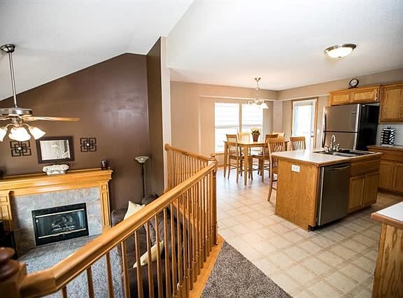 If you want no one behind you come take a look at this well maintained home with nothing but trees behind for neighbors! Spacious island kitchen w/breakfast bar & large eating area plus a walk in pantry along with all the cabinets/counter space opens to deck overlooking the large & level fenced yard! Nice size living room has fireplace! Finished lower level (stubbed for bath) is great media room and walks out to patio! Sub-bsmt for storage plus deep garage! Roof 7 years; New carpet throughout; some newer paint