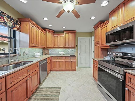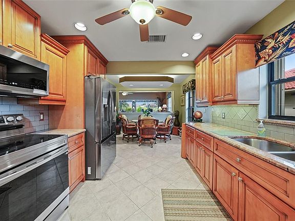 The epitome of Florida living is right here in Kingsway Golf Villas! From the moment you step inside, this immaculate three-bedroom, two-bathroom villa feels like pure luxury. Every detail has been carefully curated to create a home that’s as comfortable as it is stunning. The kitchen is a total showstopper with gleaming backsplash, endless cabinetry, and a cozy breakfast nook perfect for your morning coffee. The dining area is spacious enough for dinner parties or Sunday family gatherings, and dimmable lighting throughout the home sets the perfect mood for every occasion. The living room takes center stage with its floor-to-ceiling stone accent wall, electric fireplace, and space for your dream entertainment setup. Just off the living room, you’ll find a bonus area featuring a wet bar and even more cabinet space ideal for hosting friends or relaxing with a fun drink. The primary suite? Fit for royalty. It features its own private office area and a beautifully updated ensuite bath that feels like a spa retreat. The home also includes a generous laundry room with tons of storage and a two-car garage. Step outside to your gorgeous back patio, perfectly positioned along the manicured fairways of the Kingsway golf course. Whether you’re entertaining or simply soaking up the view, it’s the kind of space that makes every day feel like vacation. Located in the sought-after Kingsway Villas community, you’ll enjoy fantastic amenities and easy access to all the local favorites: shopping, dining, golf, and more.