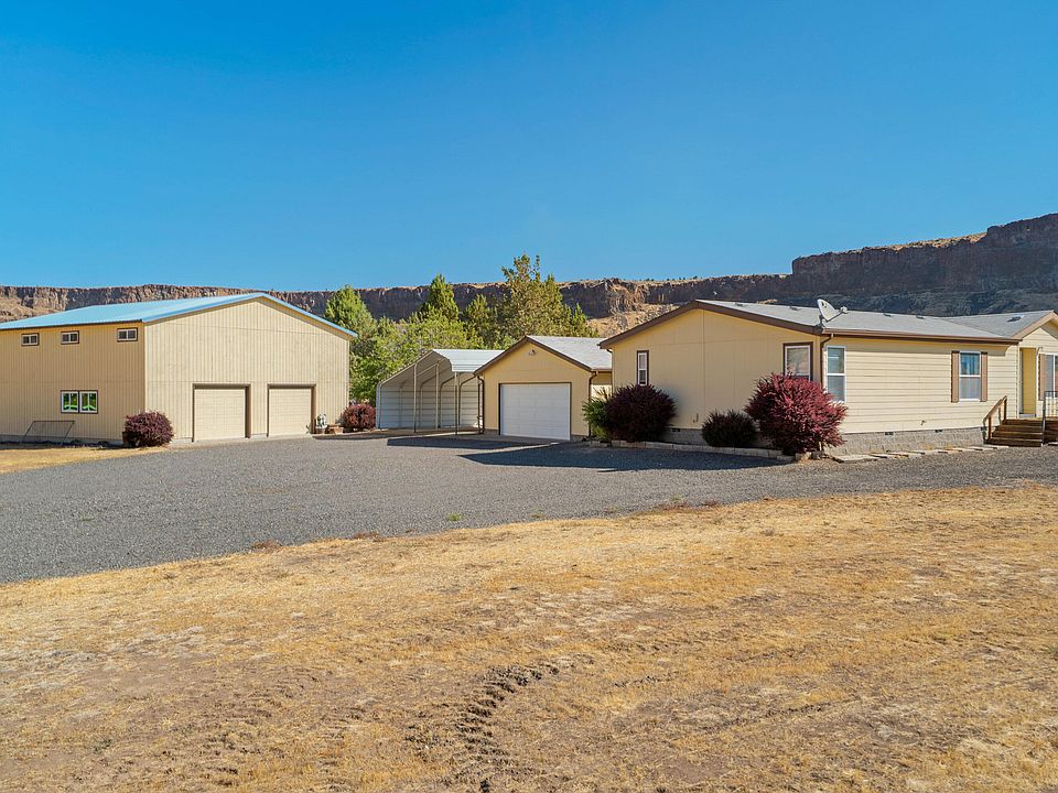 This adorable 3 bedroom 2 bathroom home on 2 acres near the quiet end of Horny Hollow has it all. 1404 square feet of living space includes a spacious primary ensuite, open living room with propane fireplace, kitchen with a pantry and breakfast bar, and vaulted ceilings over a bright living area. Outside you'll find a detached garage with opener, a dual carport for parking or storage, AND a 1600sqft shop with 2 roll-up doors and a bonus space upstairs. This groomed 2-acre property has a huge gravel turn-around for trailers or RVs, and panoramic views of the rock wall across the river canyon. Established orchard is ripe with apples and pears, and fenced to keep the deer out. Chicken coop out back is ready for your flock! Did I mention this property backs up to public lands?! Bring your DIY kit or contractor to upgrade the home to your liking. Whatever you do, don't wait to secure this incredible value in Crooked River Ranch's most sought-after corner!