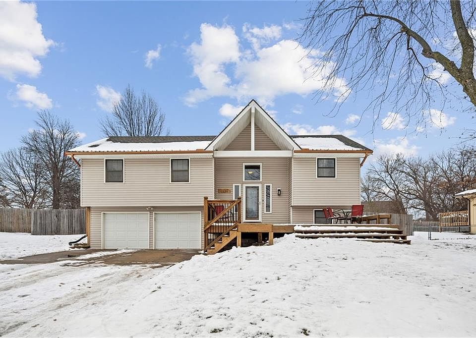 Welcome to your ideal home! Conveniently located off Cookingham in the desirable Staley High School district, this 4-bedroom, 2 1/2-bath home is both updated and ready for its new homeowner. If you envision returning to a welcoming neighborhood, you're in luck – this friendly street is precisely that. Inside, prepare to be impressed by the non-typical split entry floor plan, and don't miss the statement front door. Upon entering, the spacious entryway is where you can comfortably remove your shoes, hang up coats, and store backpacks. Upstairs, you will immediately notice the exposed beam and brick fireplace that extends up to vaulted ceilings, creating a warm and cozy atmosphere. The eat-in kitchen is not only large enough to fit an oversized table but also features modern updates such as a subway tile backsplash and ample workable counter space. The bedrooms are generously sized, with the primary bedroom featuring a vaulted ceiling and a private bath.The freshly finished family room is a highlight with your second wood-burning fireplace, an additional bedroom, and a convenient half bath. Outside, unwind on either deck – both at the front and back – providing excellent outdoor living spaces. The flat, fenced-in backyard adds extra versatility to your outdoor experience. It feels like home, and the fresh interior paint and flooring, coupled with craftsman black hardware, add to the overall charm. Welcome home to 11439!